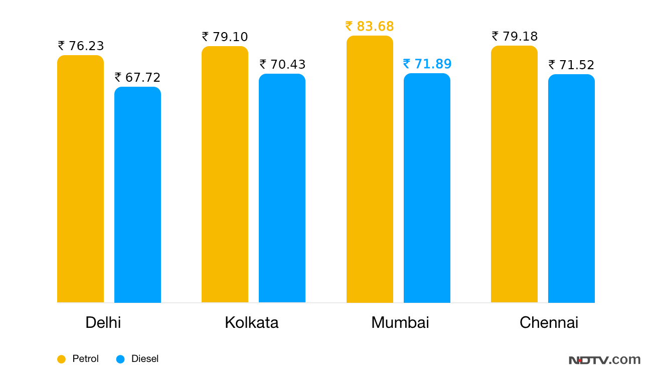 Petrol prices, however, were kept unchanged across the four cities. One litre of petrol was being sold in Delhi for Rs 76.23, in Kolkata for Rs 79.10, in Mumbai for Rs 83.68, and in Chennai for Rs 79.18.