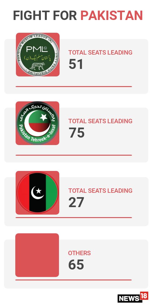 Counting of votes in Pakistan's General Elections is underway and Cricketer-turned-politician Imran Khan Pakistan Tehreek-e-Insaf is leading on 74 parliamentary seats while its main rival Pakistan Muslim League-Nawaz (PML-N) is ahead on 54 seats in the initial round. The Pakistan Peoples Party (PPP) of former president Asif Ali Zardari is leading on 27 seats, a sign indicating that he could play a 'kingmaker' in case of a hung parliament, according to media reports. Independents are leading on 23 seats according to trends available for 209 seats out of 272 seats. The Muttahida Majlis-e-Amal (MMA) - an alliance of traditional religious parties such as Jamaat-e-Islami led by Qazi Hussain Ahmed, Jamiat Ulema-e-Islam-Fazl headed by Maulana Fazlur Rehman, Jamiat Ulema-e-Pakistan led by Maulana Shah Ahmad Noorani and Tehreek-e-Jafaria led by Allama Sajid Naqvi - is leading on 11 seats. Pakistan's National Assembly comprises a total of 342 members, of which 272 are directly elected whereas the rest - 60 seats reserved for women and 10 for religious minorities - are selected later through proportional representation among parties with more than five per cent of the vote. A party can only form the government if it manages to clinch 172 seats in total. The nation voted on Wednesday in a knife-edge general election that has been plagued by allegations the powerful armed forces have been trying to tilt the race in Khan's favour after falling out with the outgoing ruling party of Sharif, who was jailed on corruption charges this month. Even as Pakistan came out to vote on Wednesday, several attacks marred the elections. A suicide bomber killed at least 29 people near a polling centre in Quetta.